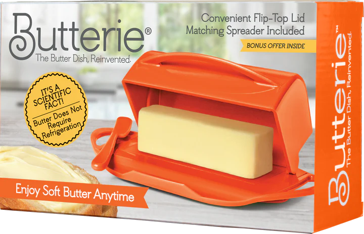 THE ORIGINAL FLIP-TOP BUTTER DISH: This clever butter dish is unlike any other. Its flip-top lid is attached to the base, making it all one piece. As a result, the lid never touches your butter or the counter, and you don’t have to worry about where to set the lid.